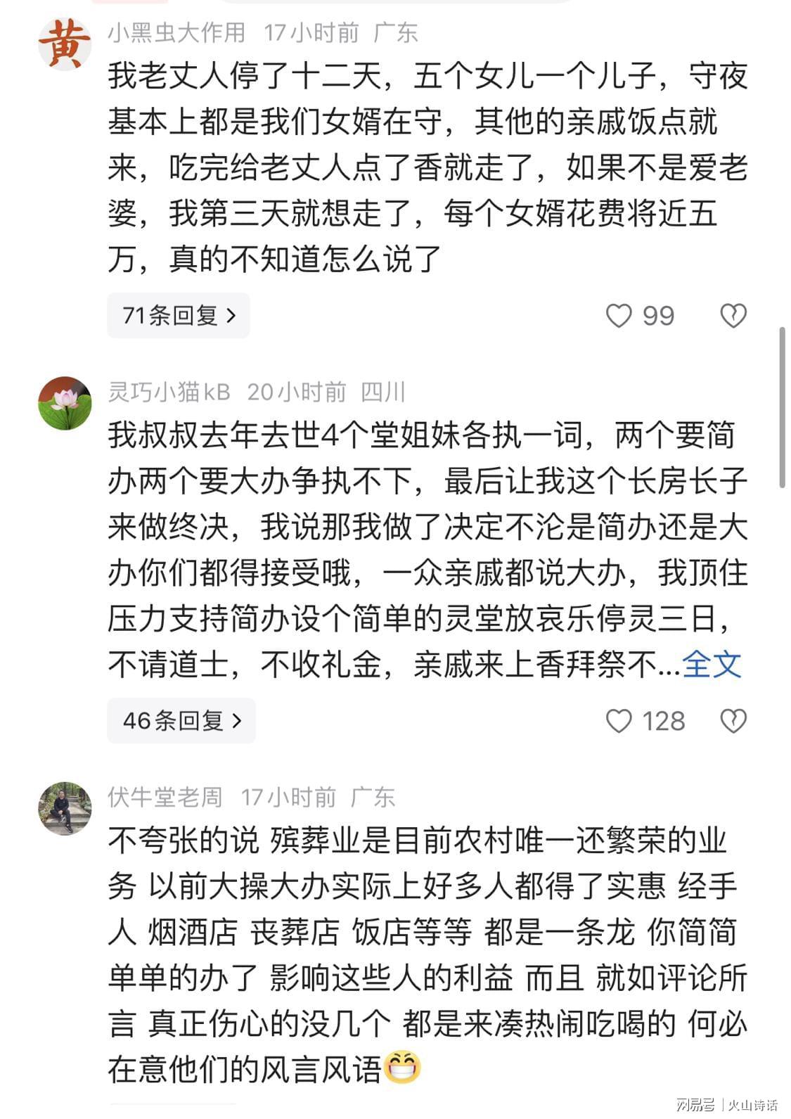 此帖一发,迅速引发网友热议浪潮。有网友表示,我老丈人停了十二天,五个女儿一个儿子,守夜基本上都是我们女婿在守。其他的亲戚饭点就来,吃完给老丈人点了香就走了。如果不是爱老婆,我第三天就想走了,每个女婿花费将近五万,真的不知道怎么说了。