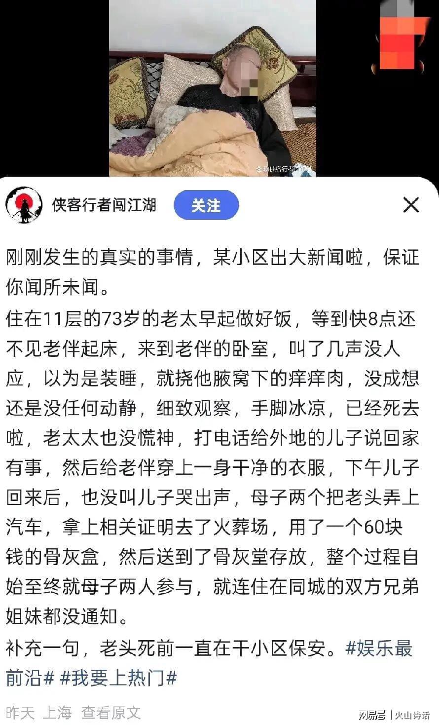 近日,一名上海老太太发现老头在睡梦中去世了,她通知儿子,然后母子俩把老头拉到火葬场火化了,花60元钱买的骨灰盒,寄存了。老太太处理完老头的后事只用一天,谁都没通知,连同城的亲人都没告诉