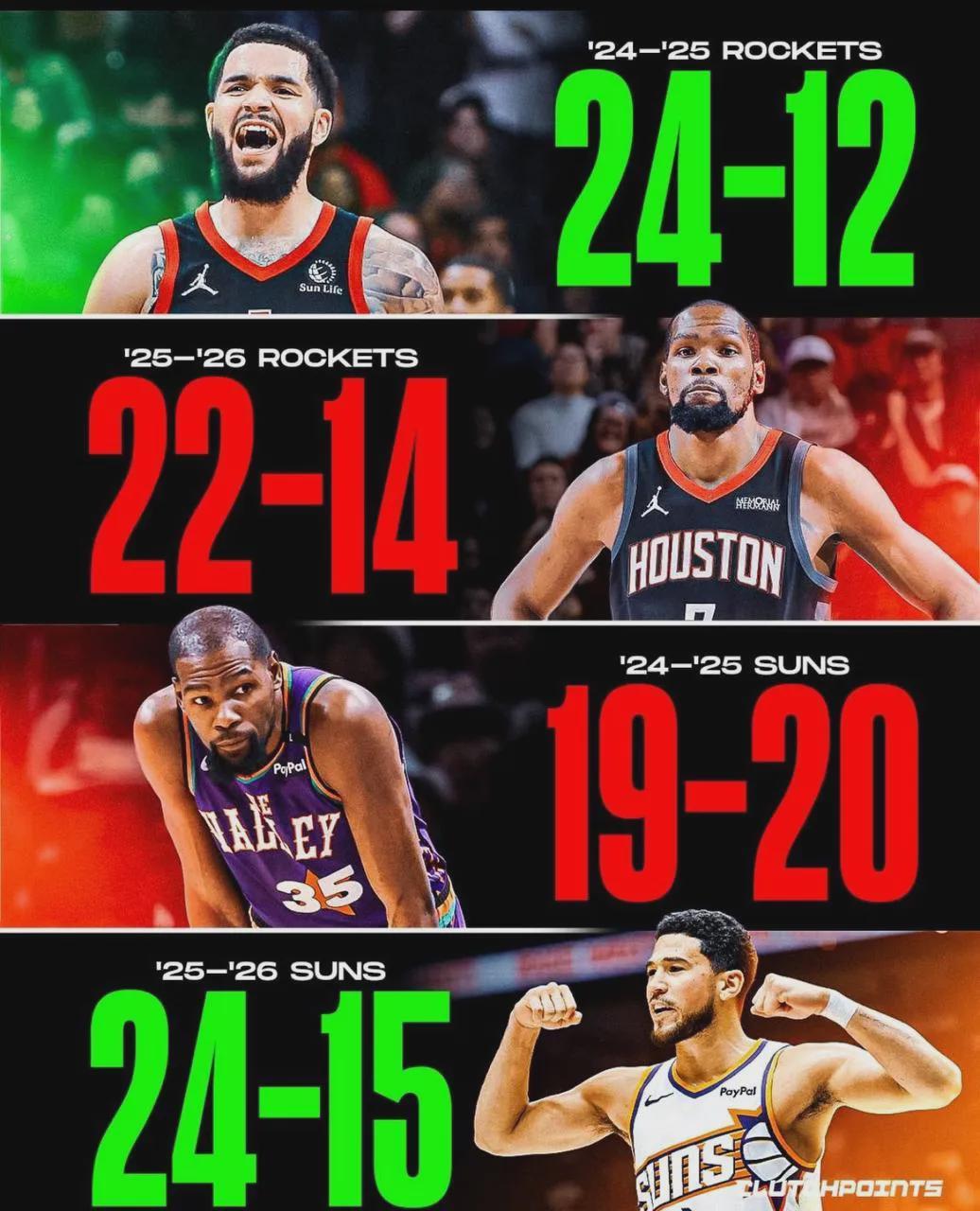 太阳24胜15负西部第六升至季后赛区域,火箭22胜14负掉入附加赛区域。